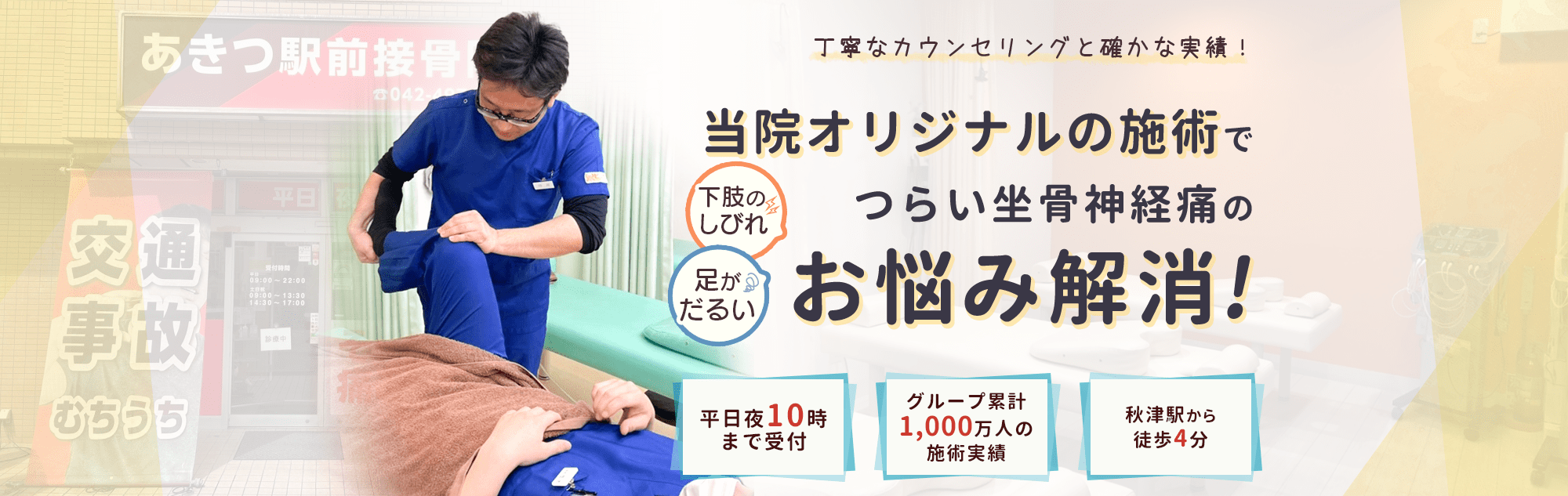 当院では確かな実績とここでしか受けられないオリジナルの施術で痛みの早期改善を目指します。丁寧なカウンセリングとわかりやすい説明で安心して施術を受けていただけるよう努めます。どこに行っても改善されなかったという方も諦める前に当院にご相談ください。