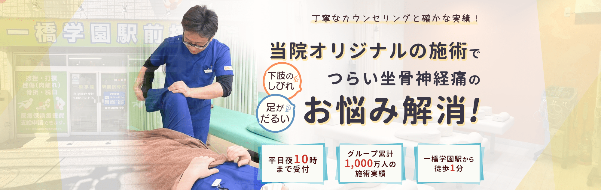 当院では確かな実績とここでしか受けられないオリジナルの施術で痛みの早期改善を目指します。丁寧なカウンセリングとわかりやすい説明で安心して施術を受けていただけるよう努めます。どこに行っても改善されなかったという方も諦める前に当院にご相談ください。