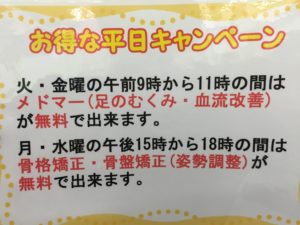 火曜日と金曜は午前9時~11時迄⇒メドマー(足のむくみ・血流改善)