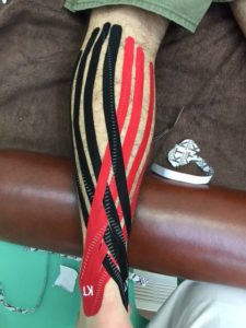 この写真のテープは、アキレス腱をサポートするテーピングです。