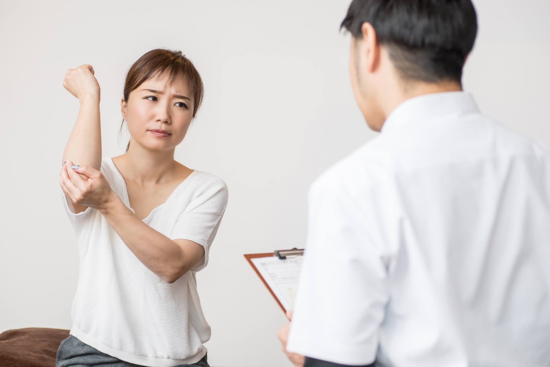 ゴルフ肘は手首を回転させる動作や少し捻る動作などによって、肘の内側に痛みが広がるようになってきます。手首の状態が関係しており、手のひら側に向けるときに痛みは顕著になることが多いです。