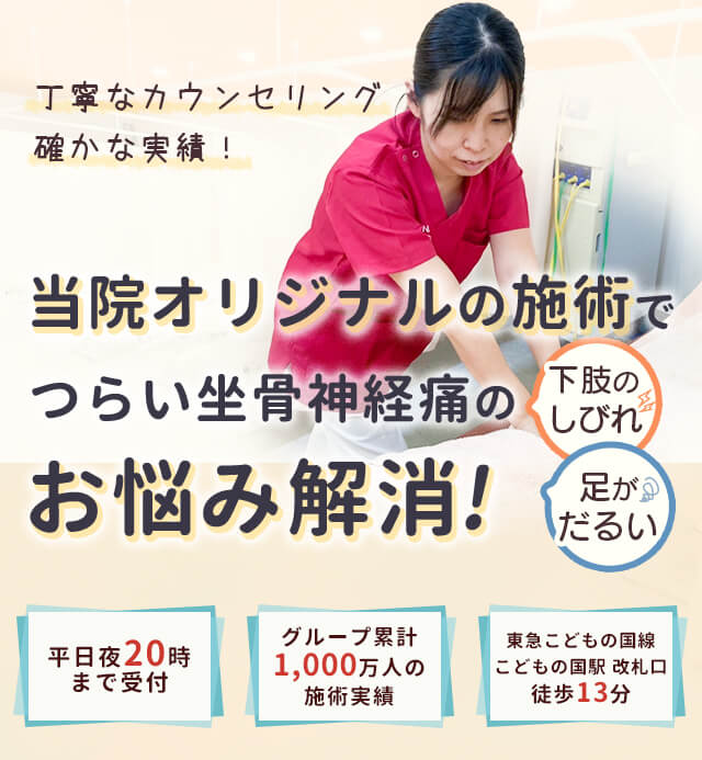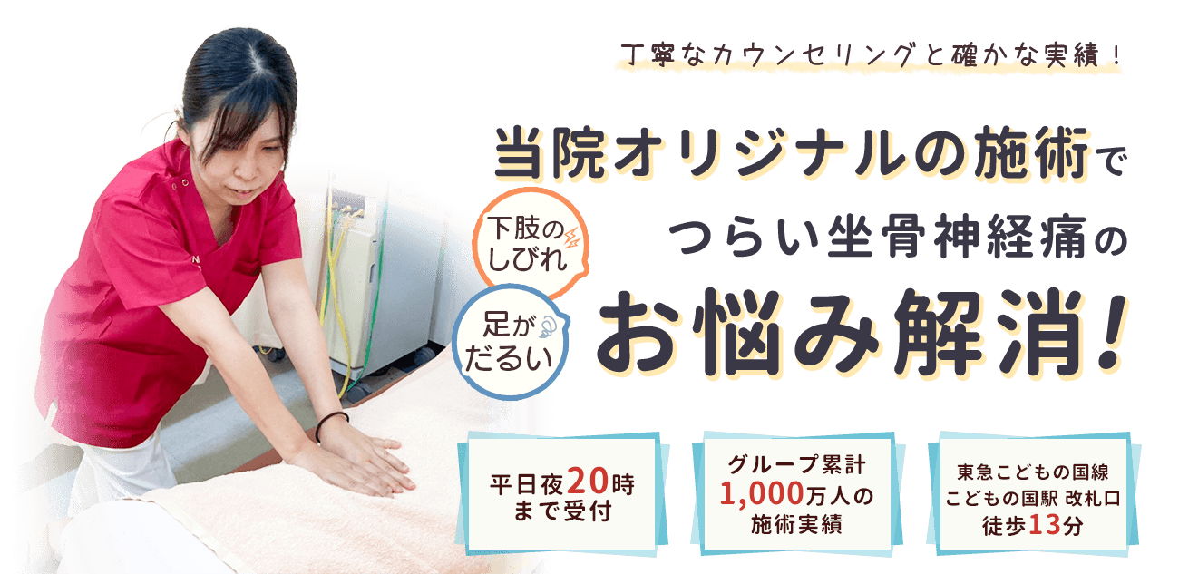 坐骨神経痛は、幅広い世代の方が発症する疾病です。坐骨神経の経路と分布領域に痛みのあるものが坐骨神経痛と呼ばれています。神経が圧迫などの障害を受けることにより、腰や下肢に疼痛やシビレを感じます。