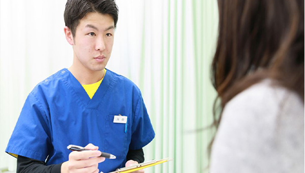 初診の方は、受付で保険証をお出しいただき、カウンセリングシートを受け取ってください。カウンセリングシートにお体の状態や痛みが出たきっかけなどをご記入ください。
