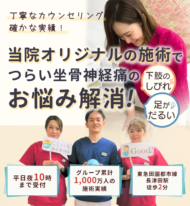 当院では確かな実績とここでしか受けられないオリジナルの施術で痛みの早期改善を目指します。丁寧なカウンセリングとわかりやすい説明で安心して施術を受けていただけるよう努めます。どこに行っても改善されなかったという方も諦める前に長津田北口鍼灸接骨院にご相談ください。