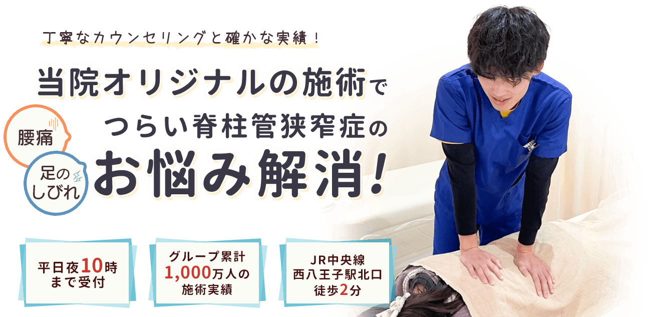 加齢によって骨が変形したり、背骨の周りの靭帯が厚くなったりすると、管が狭くなり神経を圧迫しはじめます。他にも、椎間板ヘルニアや、脊椎すべり症など背骨が変形する病気が原因となるケースもあり、事故などの突発的なダメージも原因のひとつです。