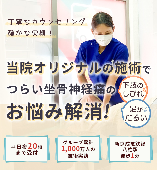 当院では確かな実績とここでしか受けられないオリジナルの施術で痛みの早期改善を目指します。丁寧なカウンセリングとわかりやすい説明で安心して施術を受けていただけるよう努めます。どこに行っても改善されなかったという方も諦める前に八柱駅前接骨院にご相談ください。
